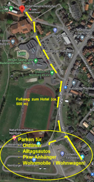 Am Hotel selber gibt es nur wenige Parkplätze. Wir dürfen unsere Oldtimer, Alltagsfahrzeuge und Anhänger jedoch auf der Festwiese abstellen, die fußläufig ca. 500 m vom Hotel entfernt liegt.